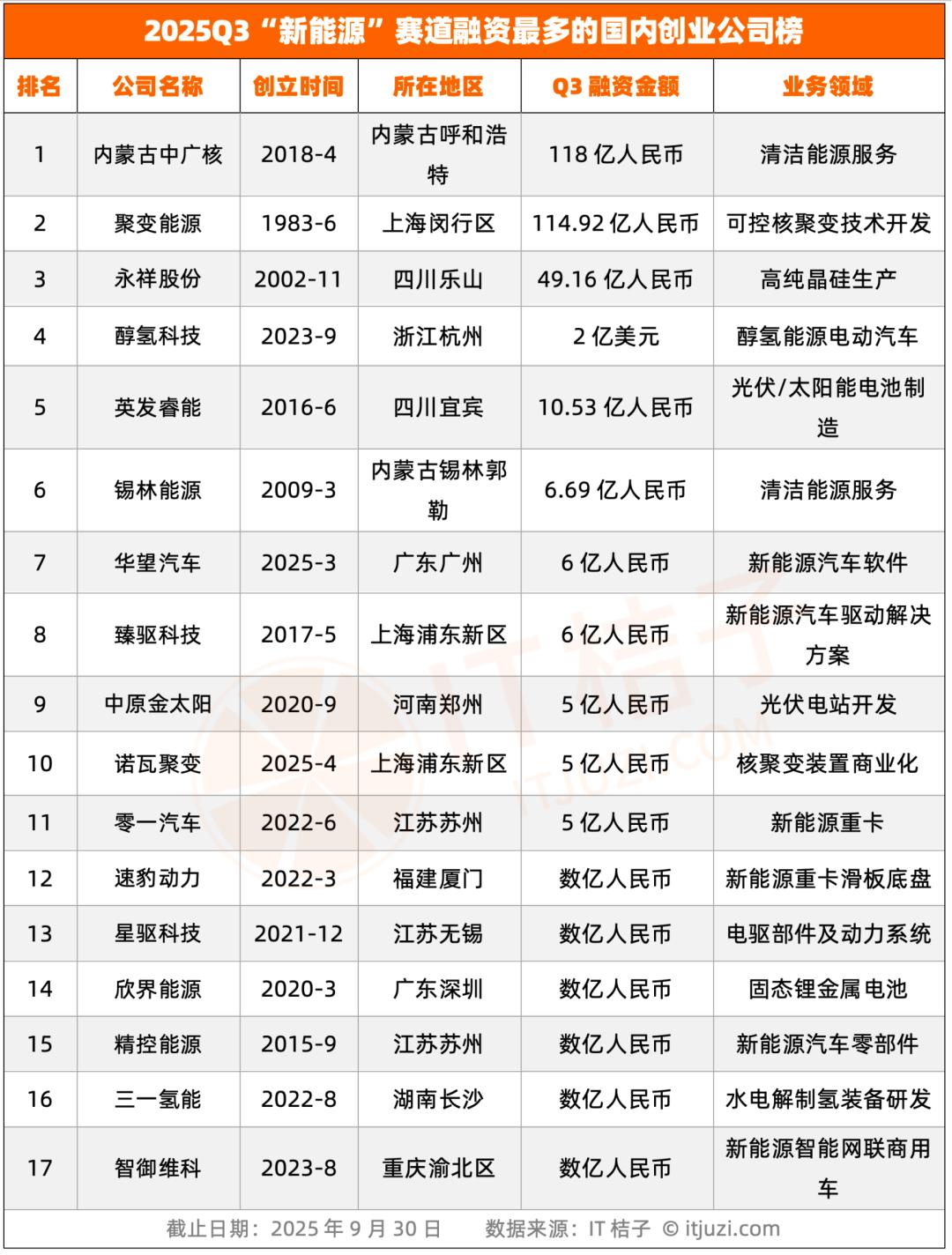 3.国企实力雄厚“打头阵”,民营企业创新能力强:从融资规模来看,有2家单笔达到了百亿元以上,他们虽是非上市企业,但均为国企或央企,具有特殊背景,代表了新能源赛道中“国家队”的实力。内蒙古中广核2025Q3单季度融资118亿人民币,为当期新能源赛道融资规模最高的企业,也是近年来内蒙古新能源领域单笔最大的战略投资项目。内蒙古中广核是中国广核集团的成员企业,此次投资主要用于中广核在内蒙古区域开发风电、光伏、储能等清洁能源项目,是推动区域能源产业转型升级的重要行动。聚变能源在今年三季度融资114.92亿人民币,此次融资用于推进新一代核聚变实验装置的升级,以及加速核聚变技术从“实验阶段”向“小规模商业化示范”的突破。可控核聚变被视为“终极清洁能源”,但技术研发周期长、投入成本高,聚变能源的大额融资不仅为自身技术研发注入资本动能,更带动了国内核聚变产业链的发展(如上游超导材料、精密仪器企业的需求增长),推动我国在全球核聚变技术竞争中占据更有利地位。国企央企在资金实力和资源方面具有突出的优势,而民营企业更多凭借技术创新能力、产业链深厚的经验技术积累获得资本的支持。例如永祥股份在今年7月融资49.16亿人民币,是光伏产业链企业中融资规模最高的企业。永祥股份成立于2002年11月,由通威集团和四川巨星企业集团共同投资设立,总部位于四川乐山,专注于高纯晶硅、多晶硅的生产与销售,是国内光伏产业链上游“硅料”环节的龙头企业之一,产品广泛应用于光伏电池、太阳能组件制造,客户涵盖隆基、晶科等头部光伏企业。还有一家新兴的新能源汽车企业值得关注——醇氢科技,成立于2023年9月,总部位于浙江杭州,今年7月宣布2亿美元A轮融资,去年底获得了1.35亿美元的Pre - A轮融资,作为成立仅2年的初创企业,这个成绩不简单。一方面,醇氢科技来头不小,背靠吉利大集团,创始人是行业资深大佬——周建群,曾任杭州万向节总厂车间主任、技术副厂长,现任浙江吉利远程新能源企业董事长。另一方面,公司此前在甲醇领域有多年的技术积累,聚焦醇氢能源新一代电动汽车研发,区别于传统纯电、氢能汽车赛道,属于细分领域的创新玩家。目前纯电汽车“充电难、续航短”,氢能汽车“储氢成本高”,醇氢能源汽车相较之下具有“补能快、续航长、燃料易存储”的优势,丰富了新能源汽车的技术路线,推动行业从“单一技术路线”向“多元技术竞争”转型。