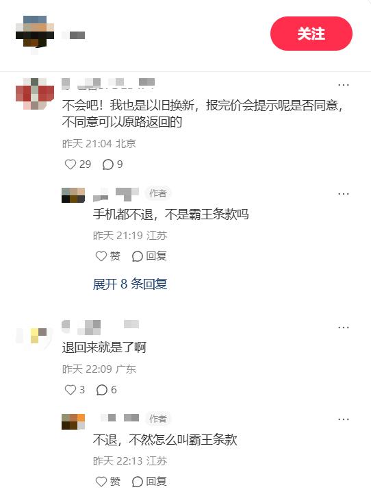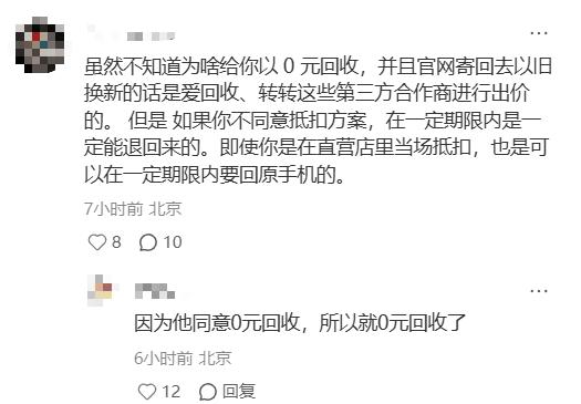 对于此事,评论区有人指出,“如果不同意抵扣方案,在一定期限内是可以退回的。即使是在直营店里当场抵扣,也能在一定期限内要回原手机。”