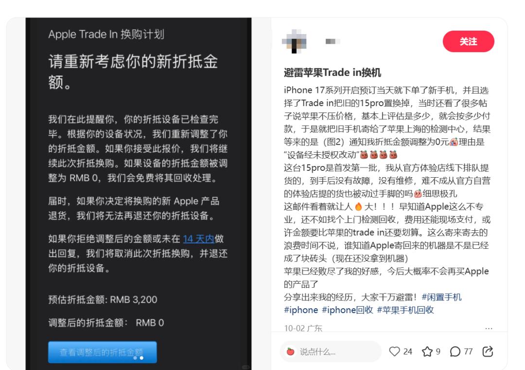10月初,就有网友发文称,在参与苹果Trade In换购计划时,将旧的iPhone 15 Pro以预估3200元的金额折抵换购iPhone 17系列。该网友表示这台15 Pro在自己手里从未出过故障,也没有维修过,但苹果检测后以 “设备经未授权改动” 为由,将折抵金额调整为0元。截图显示,预估折抵金额3200元,调整后的折抵金额为0元。