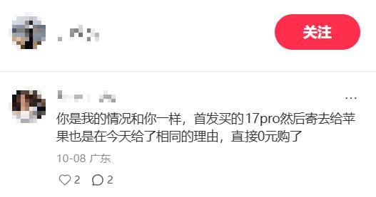 另有网友表示,“我的情况和你一样,首发买的17 Pro然后寄去给苹果也是在今天给了相同的理由,直接0元购了。”