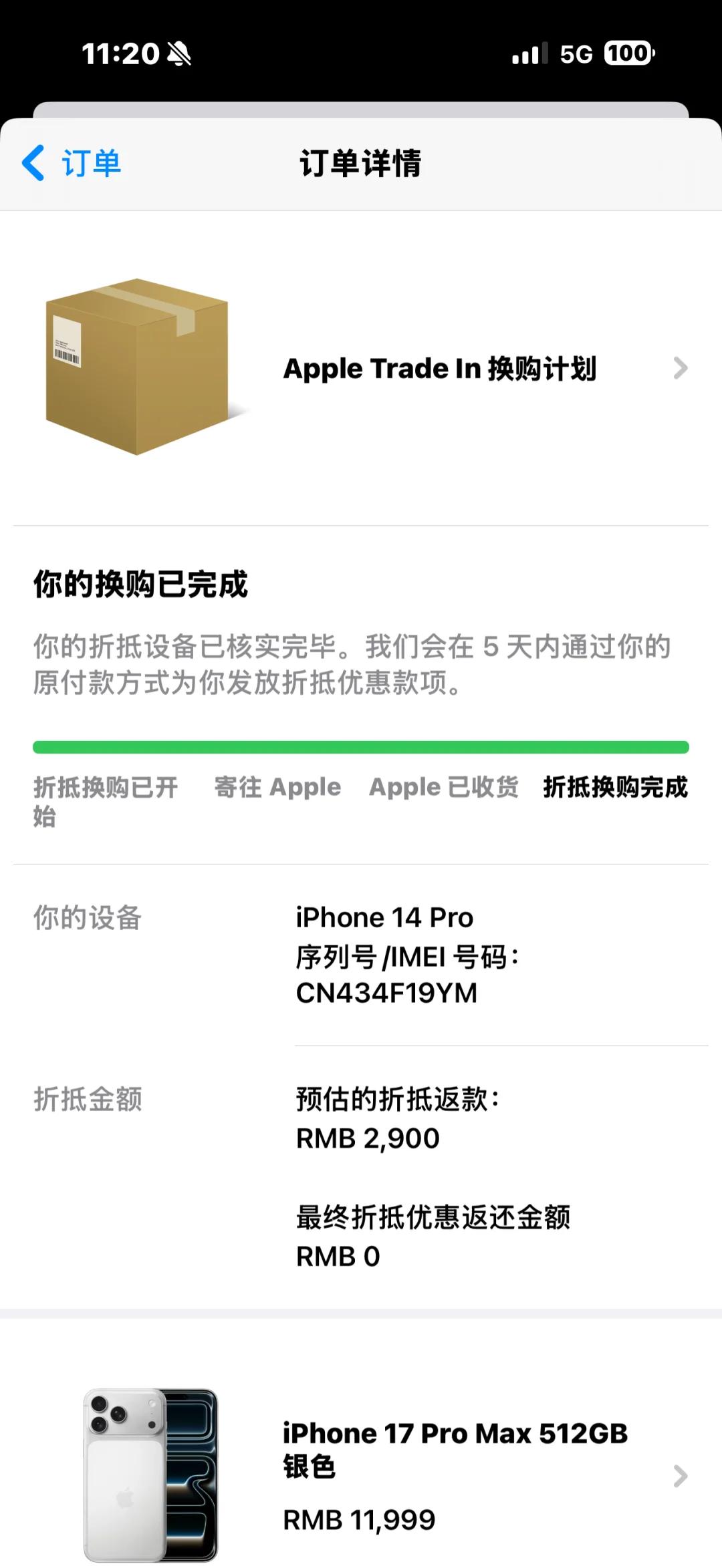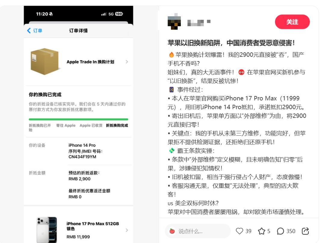 该网友表示,他在苹果官网购买售价11999元的iPhone 17 Pro Max时,打算用旧机iPhone 14 Pro进行抵扣,官方承诺可抵扣2900元。然而,当他将旧机寄出后,苹果单方面以“外部维修”为由,直接将原本承诺的2900元抵扣金额归零。