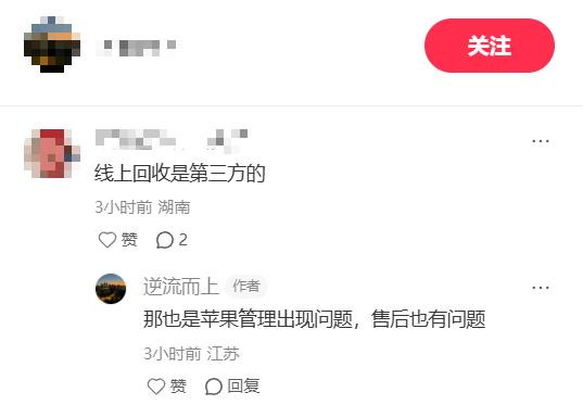 同时,也有人评论称,“线上回收是由第三方负责的。”网友则回复表示,“那也是苹果管理出现问题,售后也有问题。”