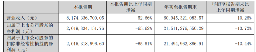 三季度单季,五粮液营收81.74亿,同比下跌52.66%,近乎腰斩;净利润20.19亿,同比下跌65.62%,直接砍了六成半,这几乎等同于业绩爆雷。