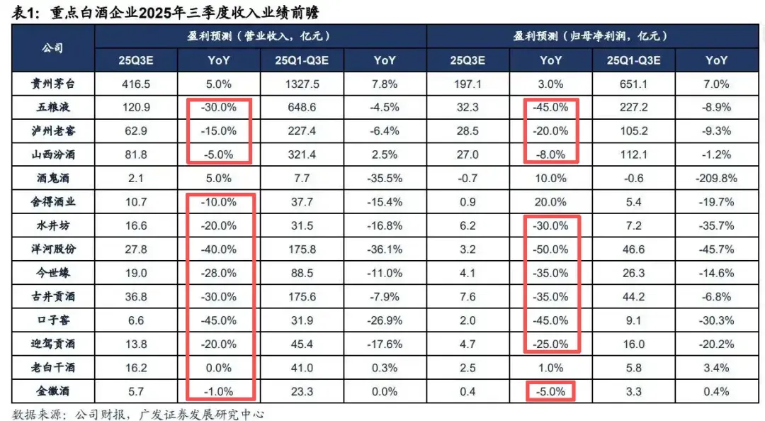 一向稳如泰山的茅台,这次都差点没稳住,更离谱的是行业老二五粮液。此前,各大券商对白酒企业三季报进行过预测,普遍预计三季度业绩下滑。当时大家还觉得广发证券的预测过于悲观,可谁能料到,最终结果显示广发证券还是乐观了。