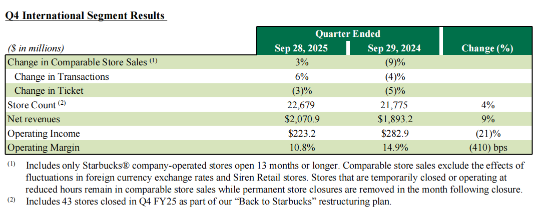 10月30日电话业绩会上,星巴克CEO倪睿安称“本财年以强劲的势头收官”。财报显示,2025财年星巴克全球营收增长5%,第四季度全球同店销售额增长1%,是七个季度以来首次正增长。