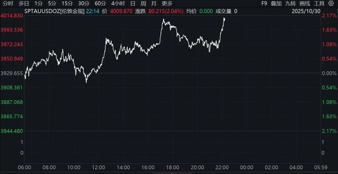 10月30日,国际金价在昨日下跌后出现拉升走高。截至发稿,现货黄金涨超2%,再度站上4000美元/盎司关口,现货白银也涨超2%。