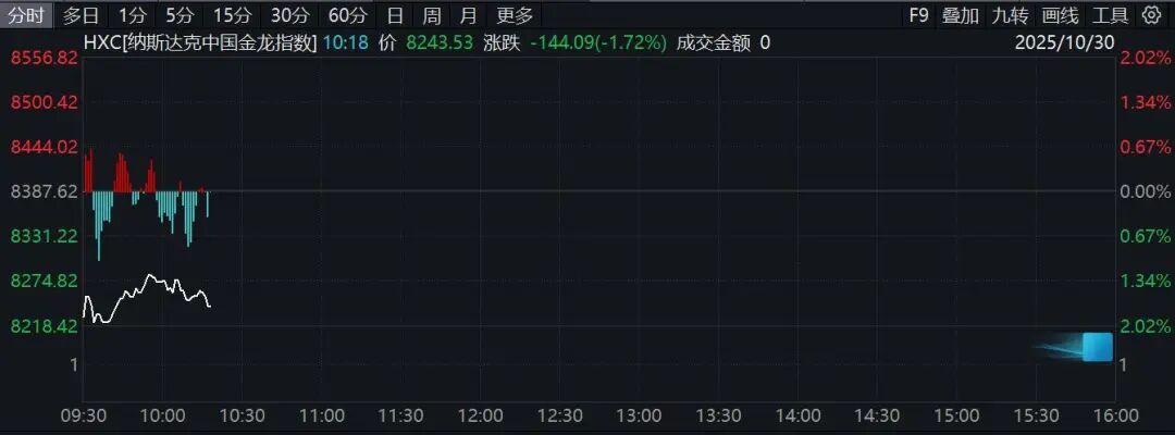 纳斯达克中国金龙指数走低,截至发稿,下跌1.7%。个股方面,百度集团跌超4%,理想汽车、阿里巴巴跌逾2%。