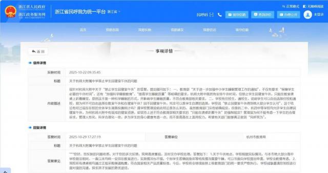 10月29日,杭州市教育局再次回复表示,关于午休地点,学校结合实际情况,和本市绝大多数高中一样,一直统一安排在教室进行,且实施情况良好。个别学生若因特殊情况需要其他午休安排,可以书面向学校提出申请,学校会酌情处理。