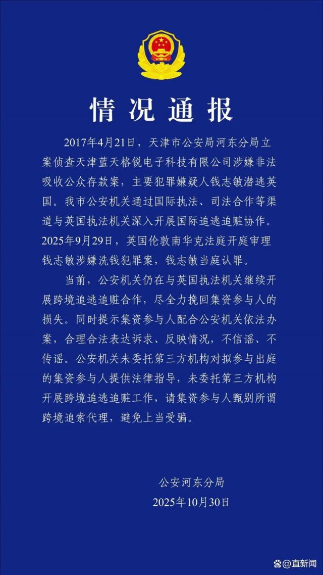 10月30日,天津市公安局河东分局发布“情况通报”。2017年4月21日,河东分局立案侦查天津蓝天格锐电子科技有限公司涉嫌非法吸收公众存款案,主要犯罪嫌疑人钱志敏潜逃至英国。此后,天津市公安机关通过国际执法、司法合作等渠道,与英国执法机关深入开展国际追逃追赃协作。