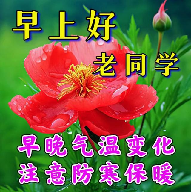 花瓣雨过,留花心给你;四季风吹,留枫叶给你;月潮涌过,留欢乐给你;清晨时分,留深深祝福给你。天气多变,注意身体!老同学,早安!