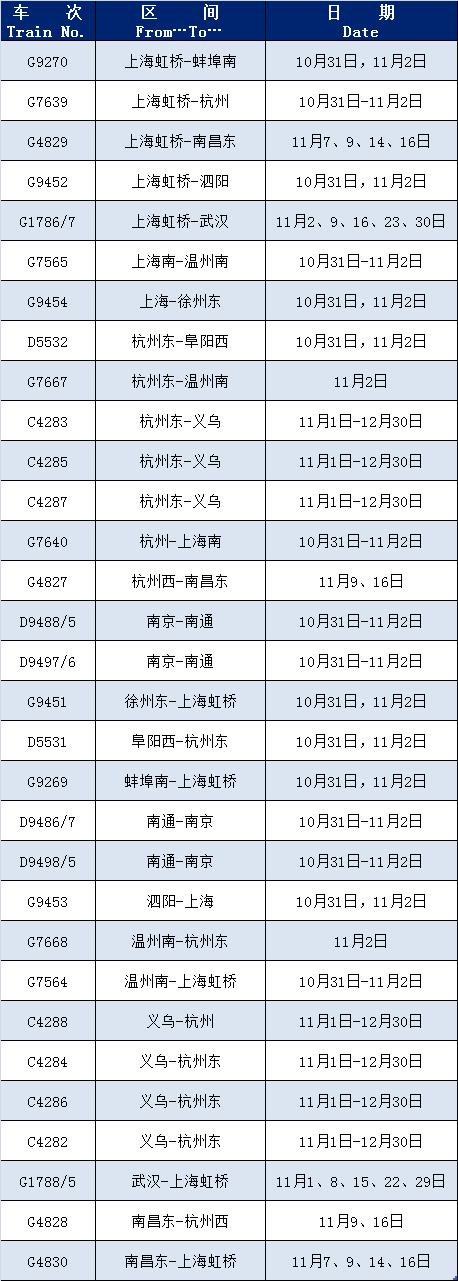 ◆ 增开列车包括上海虹桥连接蚌埠南、南昌东、武汉、泗阳等,杭州东增开至义乌(C4283/5/7等车次),满足长三角内部及向中南部的客流出行需求。