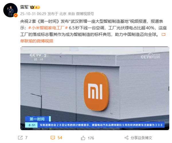 报道指出:“小米智能家电工厂每6.5秒就能下线一台空调,工厂光伏绿电占比超40%。这座工厂的落成使其成为智能制造的标杆典范,助力中国制造走向全球。”