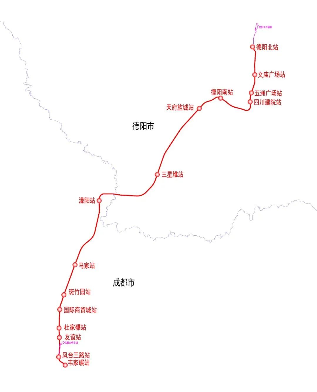 成德线全线共设15座车站,其中10座为地下车站,包括位于成都市的韦家碾站、凤凰山站(凤台三路站)、杜家碾站等,以及德阳市境内的四川建院站、五洲广场站、德阳北站等。