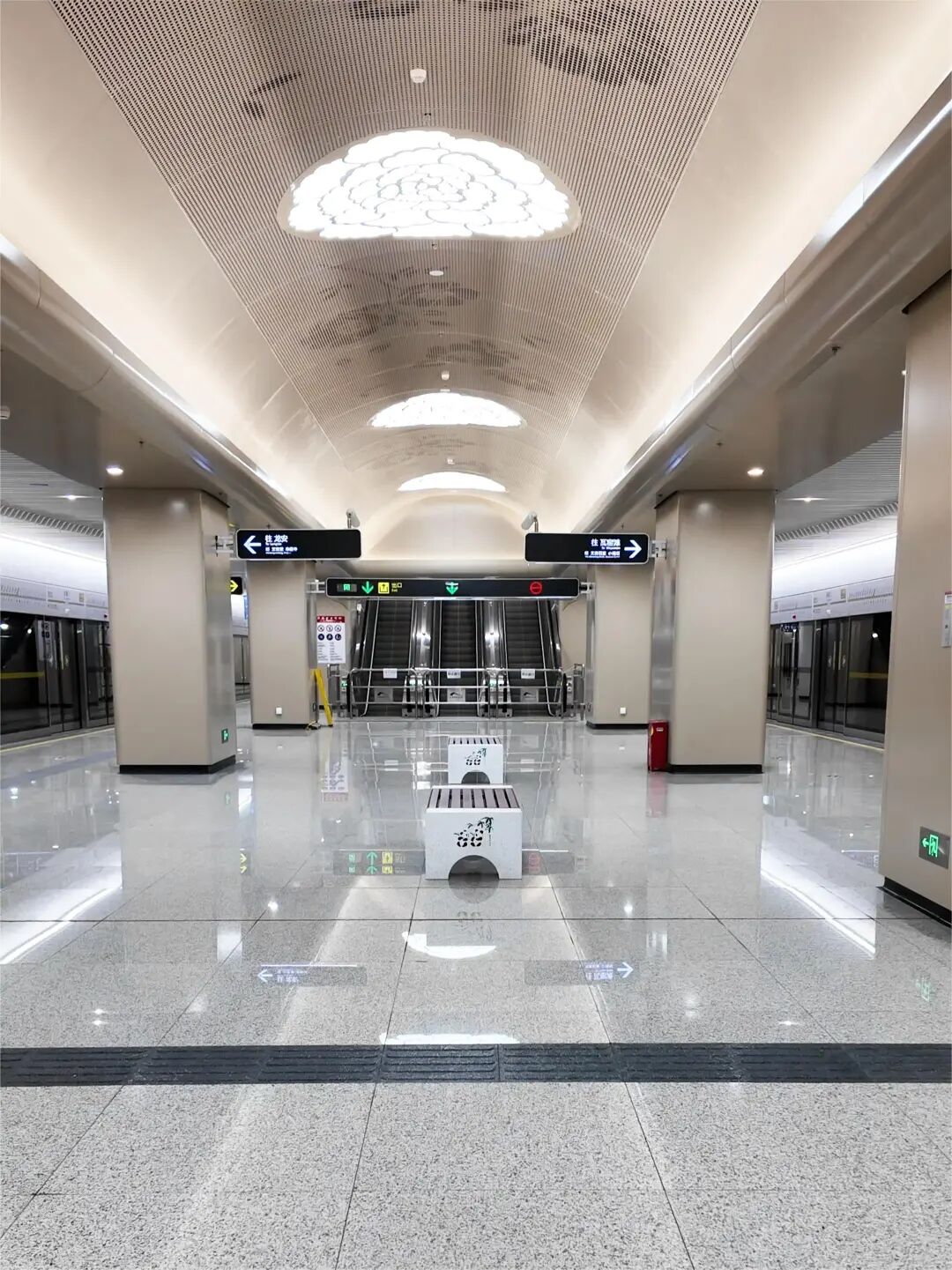 步入新南门站,连续的拱形结构唤起对古城门的记忆,天花板上芙蓉造型花灯宛若繁星点点,两侧墙面青蓝渐变如锦江波光,整体氛围简约现代而不失古典韵味。