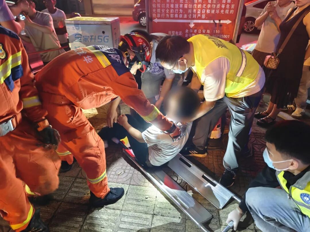 在众人的共同努力下,小伙成功脱困,并被抬上担架送医。
