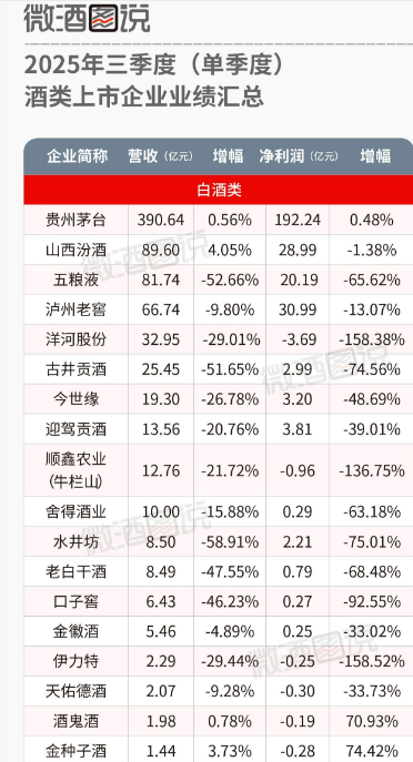 据金石杂谈统计,2025年Q3白酒企业营收、净利普遍下滑。洋河股份净利润暴降158.4%,亏损3.69亿,而去年同期盈利6.32亿;营收大幅下滑29.1%,前三季度利润腰斩。