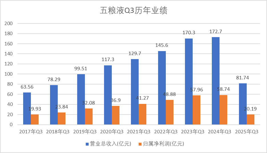 最让人意外的是五粮液竟然业绩暴雷。根据Q3业绩,五粮液营收81.74亿,回到2018年水平,利润20.19亿,还不如2018年。其中,营收腰斩,利润剧烈下滑65.6%。不过,前三季度来看,五粮液利润下滑不足15%。