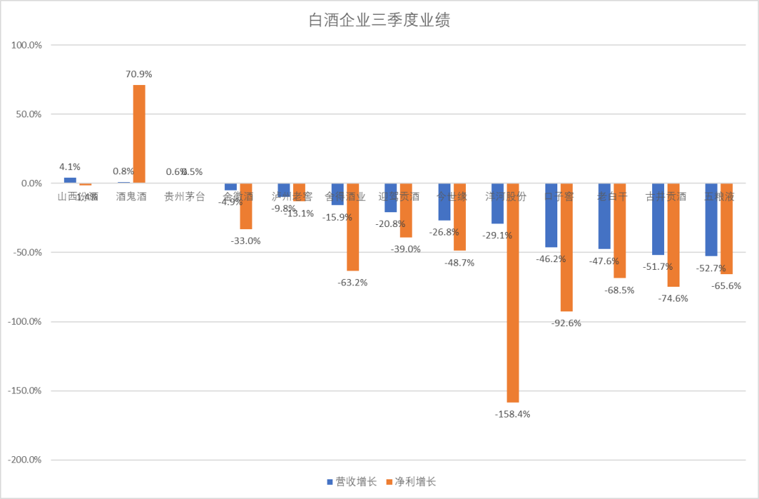 知趣咨询总经理蔡学飞表示,今年酒企三季报普遍惨淡,主要因宏观消费环境疲软,白酒消费场景收缩,特别是依赖商务宴请的中高端酒动销降低;同时行业面临高库存和价格倒挂压力,整体产能过剩,市场需求不足,企业业绩承压。不过,行业内部也有分化,贵州茅台等头部企业依然稳健,许多区域性酒企则大幅下滑。