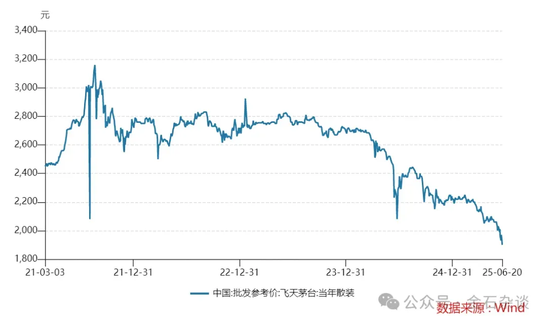 根据wind数据,21年茅台散飞价格在3000元上方,22年和23年在2500元上方,24年维持在2100元上方,如今进入2025年,已连续跌破2000元、1900元、1800元和1700元四大关口,来到1660元(今日酒价价格)。