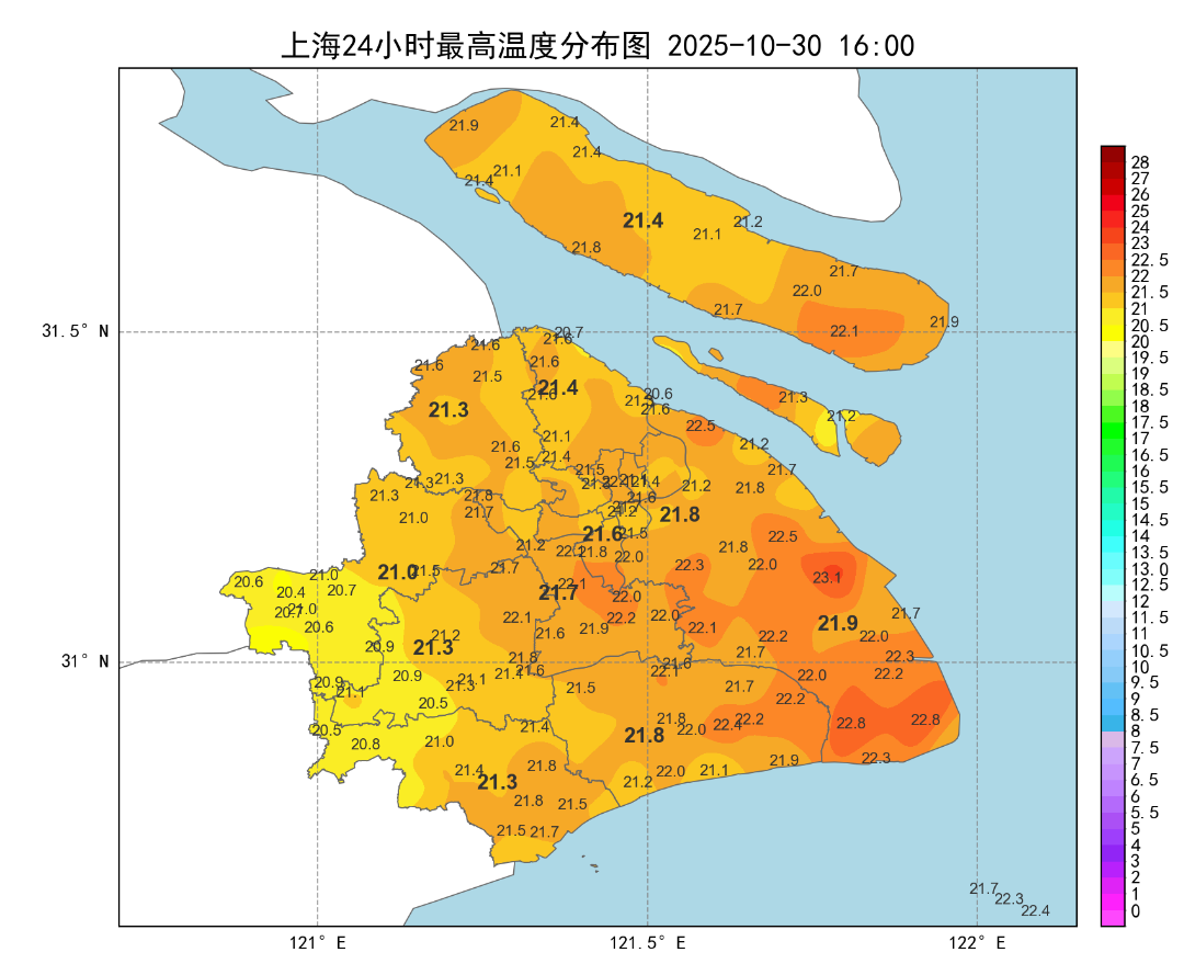 昨天申城受云层覆盖,最低气温稍高,市区徐家汇站17.7℃,郊区中崇明13.0℃为全市最低。受短波槽影响,上午阴天居多,中午开始有时下小雨,虽雨势弱,但缓解了秋燥。全市最高气温大多在21、22℃左右,徐家汇站最高21.6℃。