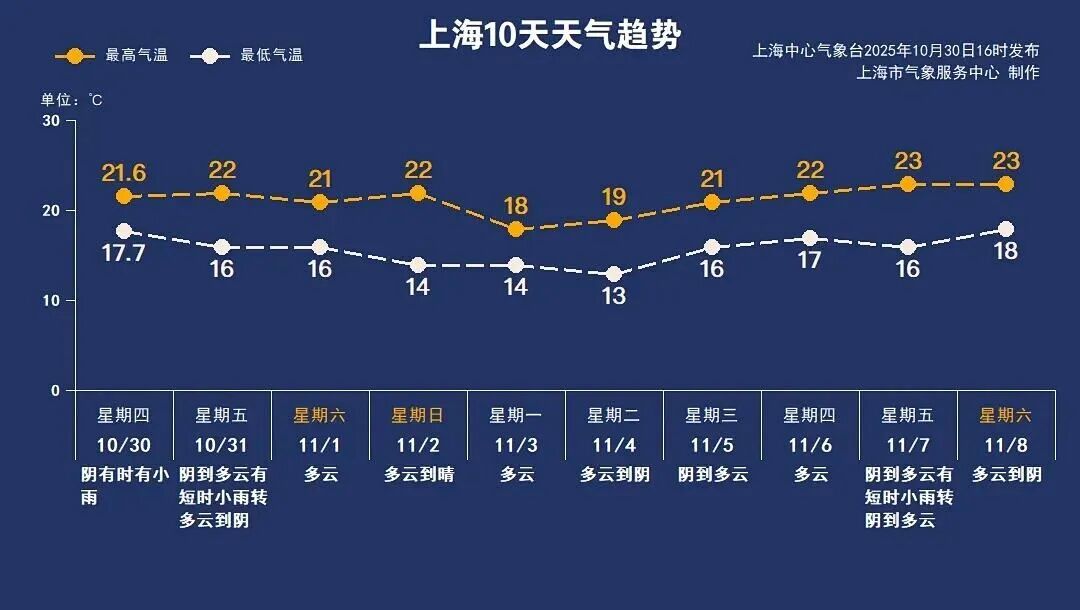 双休日申城天气好,最高气温舒适,出行洗晒都合适。下周初受弱冷空气影响,申城云系会增多,最高气温降至18 - 19℃,4 - 5级东北风一吹,会感觉很凉。周中起最高气温会略有回升,预计下周中后期最高气温将回升到21 - 23℃。下周秋燥明显,大家要多补充水分。