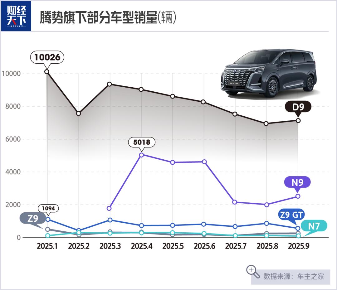 拳头产品腾势D9,前9个月销量为74906辆,虽仍位居MPV细分市场第一,但与2024年同期相比,销量同比下滑约5.57%。今年前9个月,腾势汽车累计销售115605辆,同比增长28.2%,与年初定下的30万辆销售目标还有差距。
