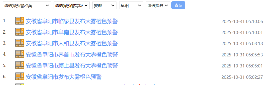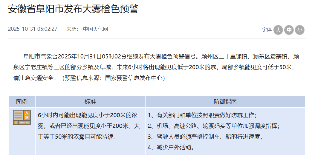 阜阳市气象台2025年10月31日05时02分继续发布大雾橙色预警信号。颍州区三十里铺镇、颍东区袁寨镇、颍泉区宁老庄镇等三区的部分乡镇及阜城,未来6小时将出现能见度低于200米的雾,局部乡镇能见度可低于50米,请注意交通安全。
