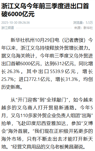10月30日,新华社客户端报道《浙江义乌今年前三季度进出口首破6000亿元》,关注到今年以来,义乌外贸增长潜力持续释放,前三季度进出口首破6000亿元,创历史新高。