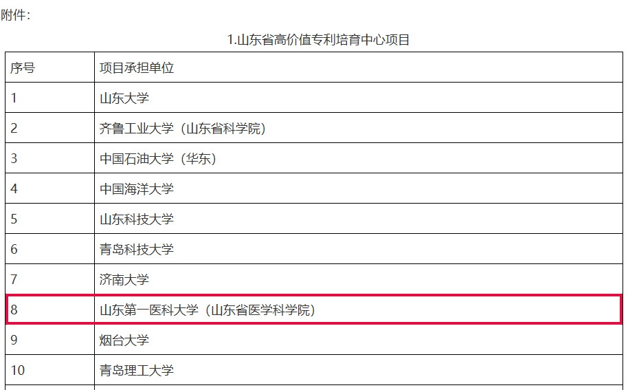 10月22日,山东省市场监督管理局公布了山东省高价值专利培育中心等项目承担单位名单,山东第一医科大学(山东省医学科学院)成功入选。