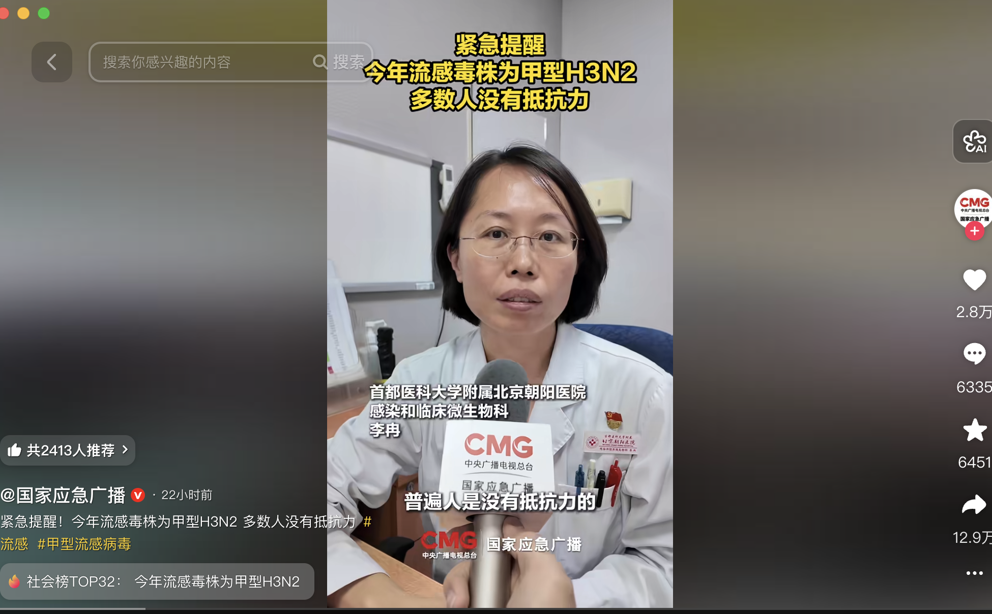 据中国疾病预防控制中心发布的流感监测周报显示,第41周(10月6日 - 10月12日)检测出的流感病毒阳性标本中,甲型H3N2毒株已成为主流。