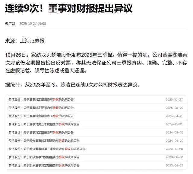 10月26日,梦洁股份(002397.SZ)发布2025年三季报,又遭自家董事陈洁投反对票。