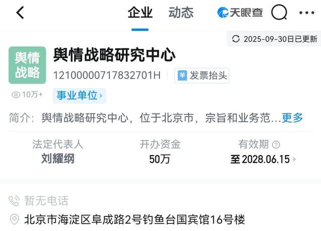 公开资料显示,舆情战略研究中心法定代表人是刘耀纲。