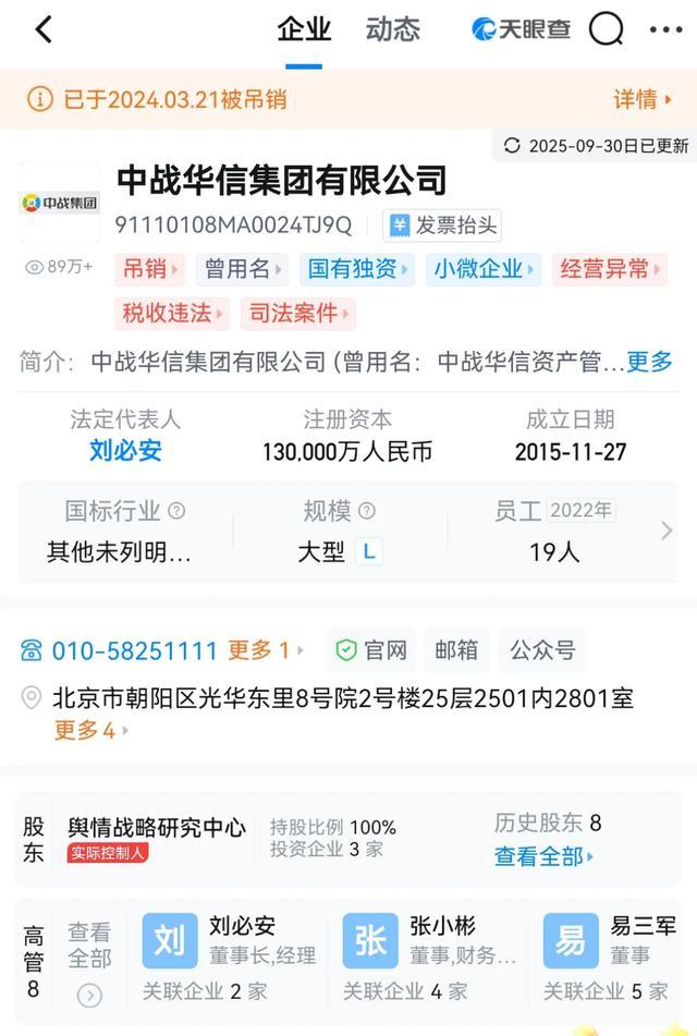 它投资的中战华富控股有限公司已经营异常,成了失信被执行人。