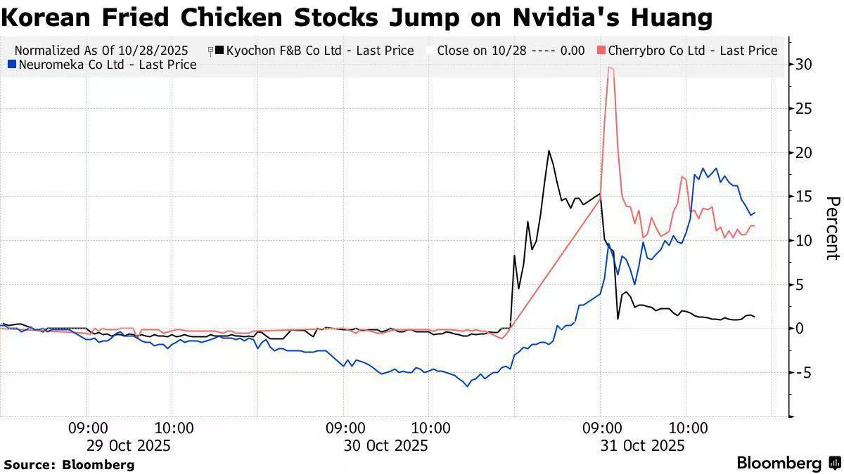 虽然Kkanbu Chicken并非上市公司,但它的竞争对手、连锁炸鸡品牌桥村F&B周五盘中股价一度大幅飙升20%。禽类加工企业Cherrybro更是触及30%的涨停板,成交量达到日均水平的约200倍。这波行情还惠及了产业链相关企业,制造炸鸡机器人的Kosdaq上市公司Neuromeka股价也有显著涨幅。