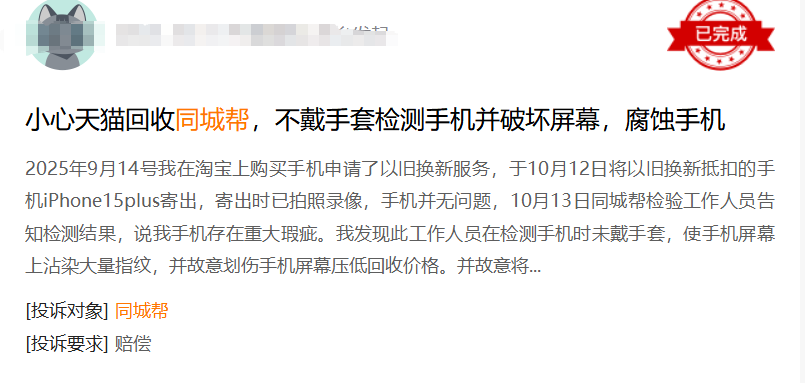 此外,博主对检测环节也有质疑。他发现同城帮检测照片里,工作人员没戴手套。他记得自己寄出时和快递员确认过手机完好,所以怀疑划痕是检测时不规范操作造成的。