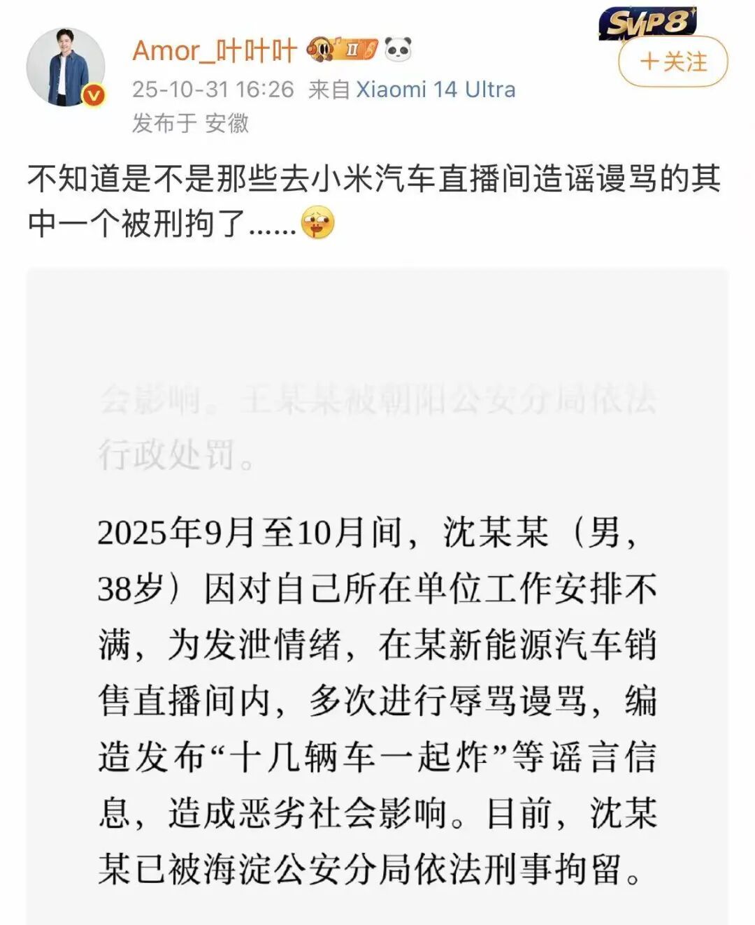 男子因在小米汽车直播间谩骂造谣被刑拘