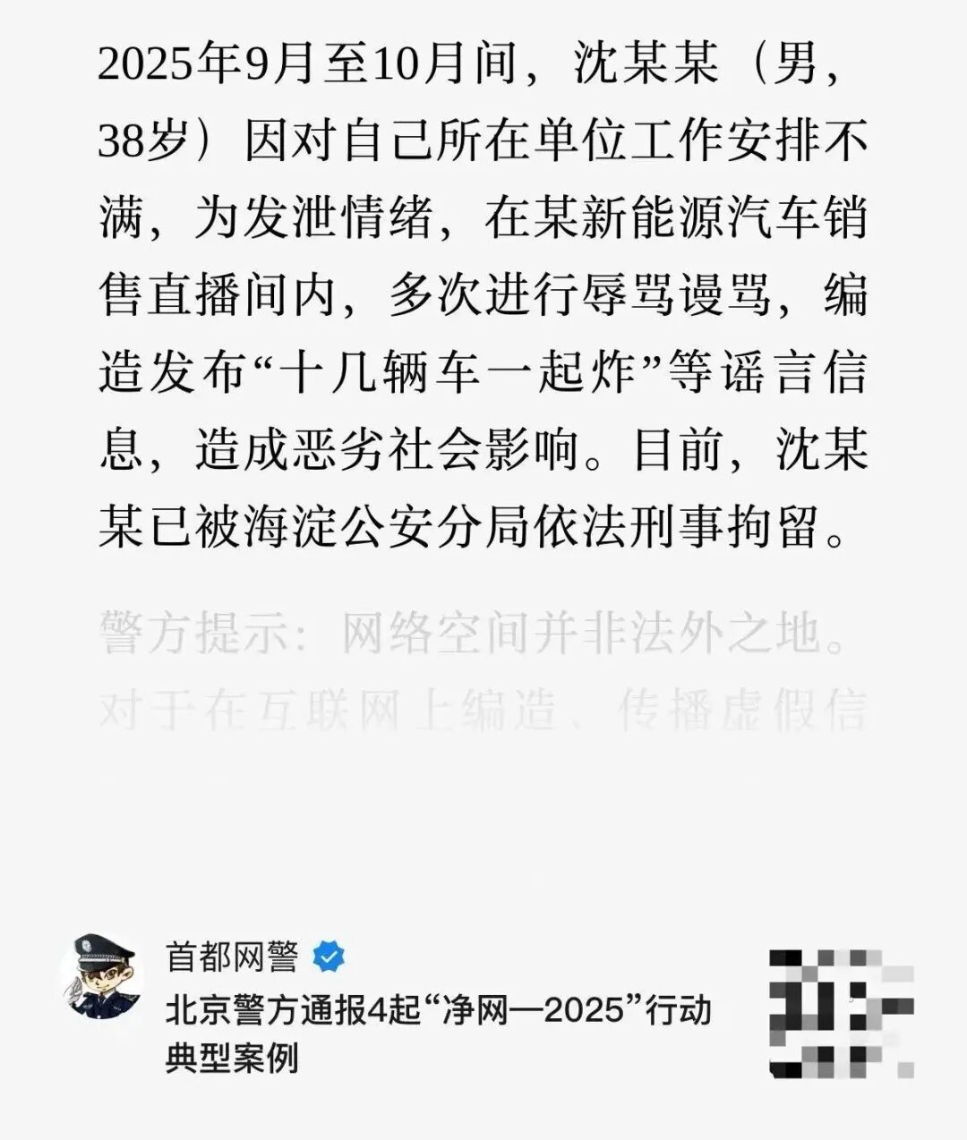 2025年9月至10月期间,沈某某(男,38岁)因对所在单位的工作安排不满,为发泄情绪,在某新能源汽车销售直播间内多次进行辱骂,还编造发布“十几辆车一起炸”等谣言信息,造成了恶劣的社会影响。目前,沈某某已被海淀公安分局依法刑事拘留。
