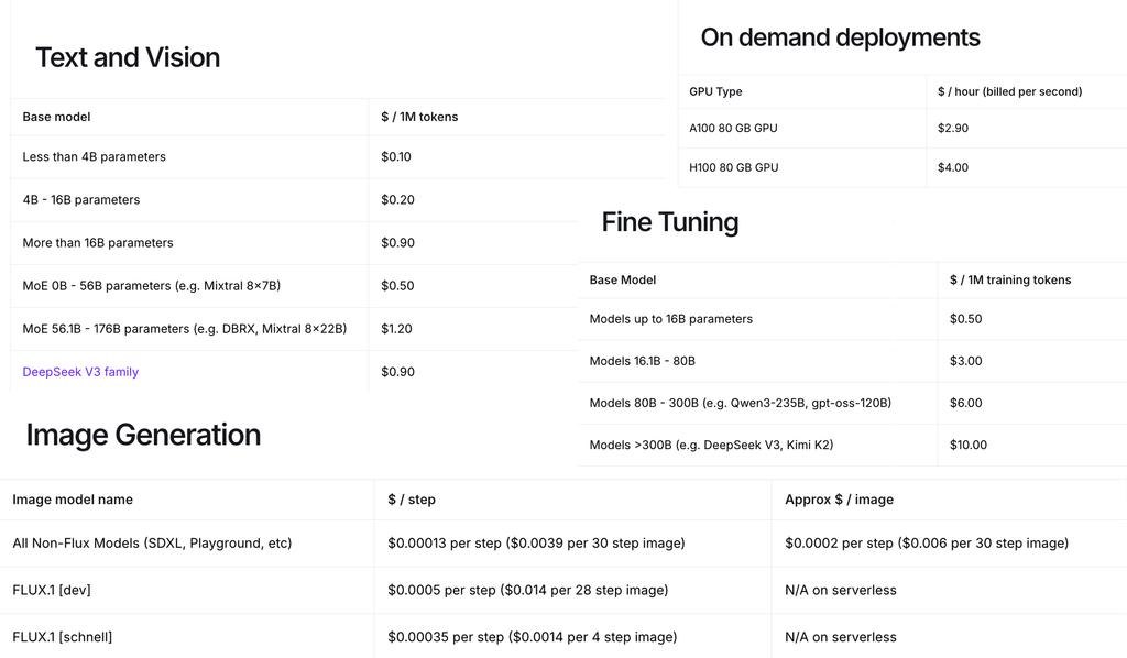 在功能定价上,Fireworks AI采用了极其灵活的定价方式,包括无服务器推理、模型微调定制和按需部署GPU。