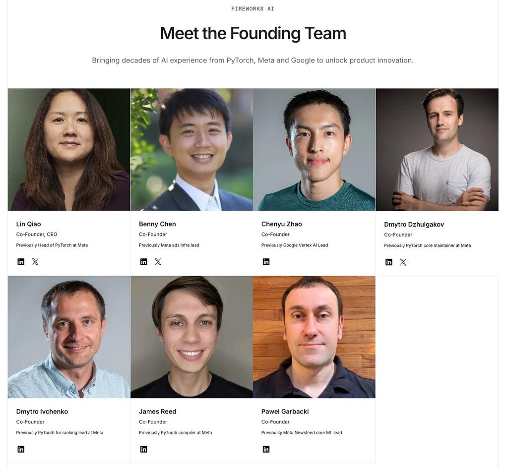 Fireworks AI创始团队的阵容堪称豪华。2022年,Meta前高级工程总监乔琳(Lin Qiao)与6位联合创始人在美国加州雷德伍德市创立了Fireworks AI。联合创始团队由6名前Meta PyTorch项目的工程师和1名前谷歌AI工程师组成。在创业前,乔琳曾在Meta领导超过300名工程师的团队,已经拥有了24年的行业经验。