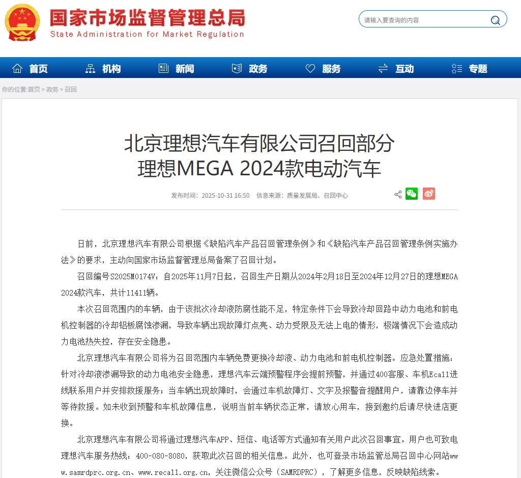 日前,北京理想汽车有限公司决定召回11411辆MEGA 2024款电动汽车,这些车辆的生产日期是从2024年2月18日至2024年12月27日。本次召回范围内的车辆,由于该批次冷却液防腐性能不足,在特定条件下会导致冷却回路中动力电池和前电机控制器的冷却铝板腐蚀渗漏,进而使车辆出现故障灯点亮、动力受限及无法上电的情况。极端情况下会造成动力电池热失控,存在安全隐患。