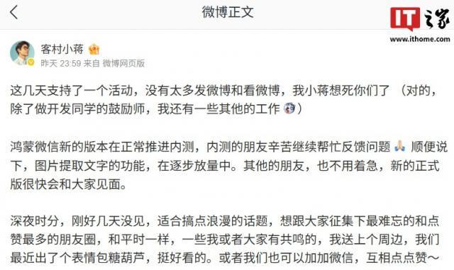 微信员工 @客村小蒋在10月29日23:59发文称,鸿蒙微信新的版本在正常推进内测。他还透露,图片提取文字的功能在逐步放量中。其他的朋友也不用着急,新的正式版很快会和大家见面。