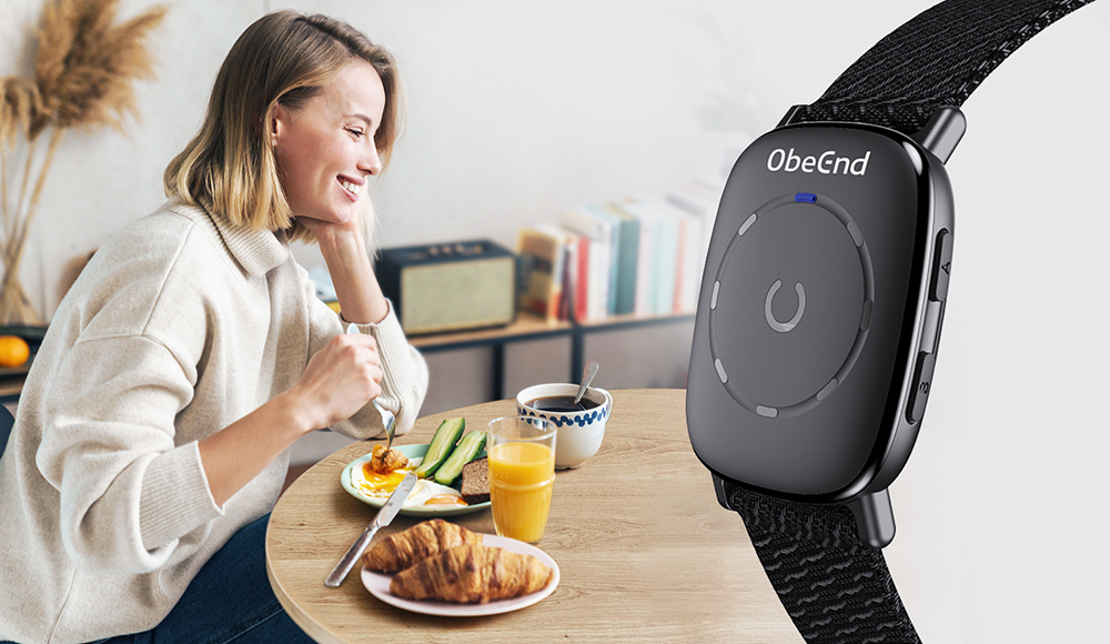 从外观上看,ObeEnd手环和普通运动手环差别不大,其奥秘藏在手腕内侧的金属片上。戴上手环,手腕内侧能立刻感觉到轻微的电流感,这表明手环正通过特定频率电流影响胃的活动。
