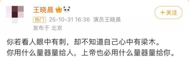 王晓晨今日发文:“你若看人眼中有刺,却不知道自己心中有梁木。你用什么量器量给人,上帝也必用什么量器量给你。”这是咋啦?这两口子想当诗人呀?