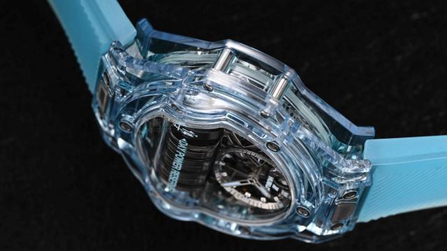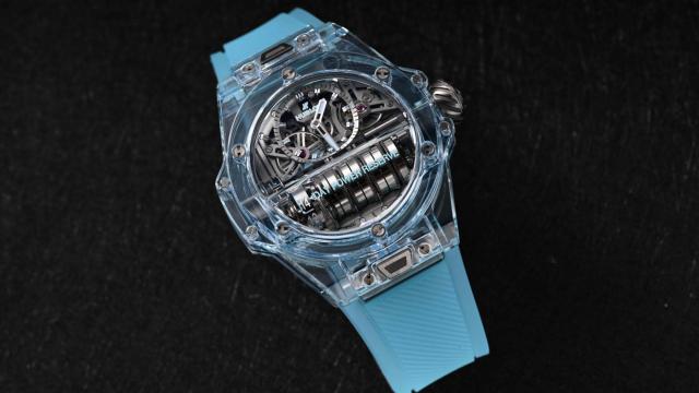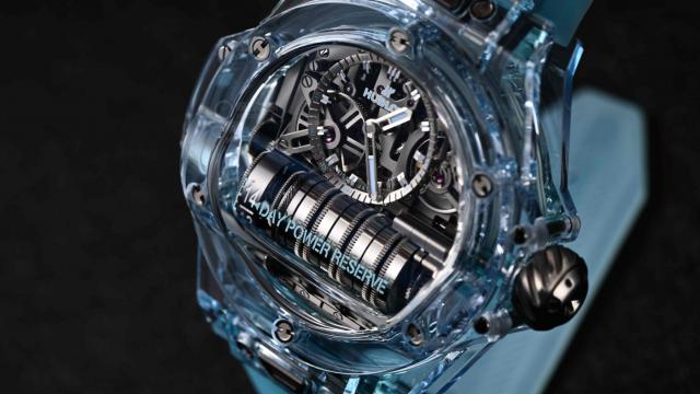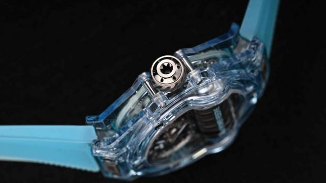 在2024年的Big Bang MP - 11腕表(型号:911.JL.0129.RX)中,宇舶通过全新的化学配方定制,推出了一种全新水蓝配色的蓝宝石表壳,在我看来这是真正的冰蓝色。它不仅有专属的透明度指数,还能保证蓝宝石本身坚固耐磨的稳定性。独特而美妙清透的冰蓝色蓝宝石表壳,经过宇舶典范级别的抛光工艺处理。