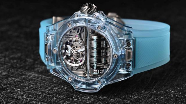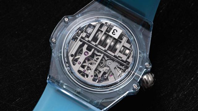 或许有人会好奇,将发条盒从机芯中单独拿出后,动力是如何传到机芯的呢?宇舶采用了少见的90度螺旋式齿轮传动系统来传导动力。表盘的上半部分采用镂空的小表盘显示时间,品牌标识、时标和指针都以与表壳相似的水蓝色进行装饰,还能看到下方9点位的螺旋式齿轮和2点位的摆轮。