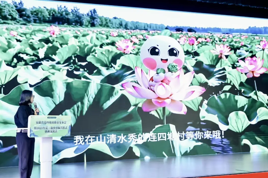活动现场播放了连四塘村纪实短片,展现了专家教授和青年学子深入田间地头的场景。上海农林职业技术学院借助“设计赋美、文化育美、品牌铸美、传播致美、经营创美”的“五美”服务体系,从“花香莲塘”规划、徽派庭院建设,到红色文化挖掘、农业品牌升级与数字化营销等方面,助力连四塘村实现了美丽转变。会议还发布了融合地方特色的连四塘村IP形象以及《石婆店镇全域旅游地图》。