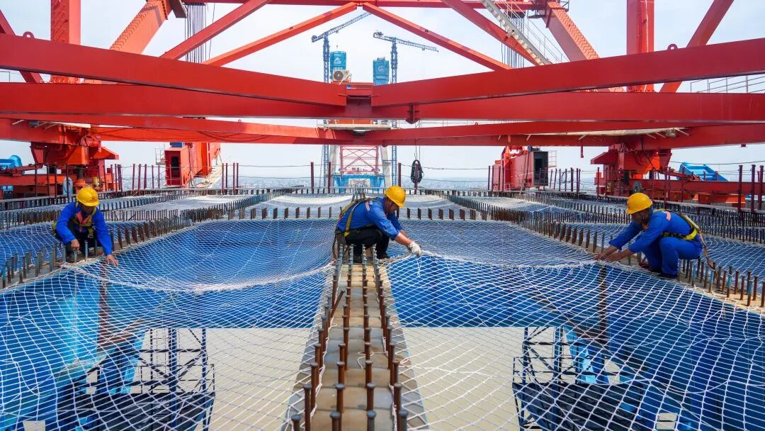 在沪渝蓉高铁V标崇启公铁长江大桥主通航孔桥钢梁架设现场,工人们正在布置公路桥面的安全网。