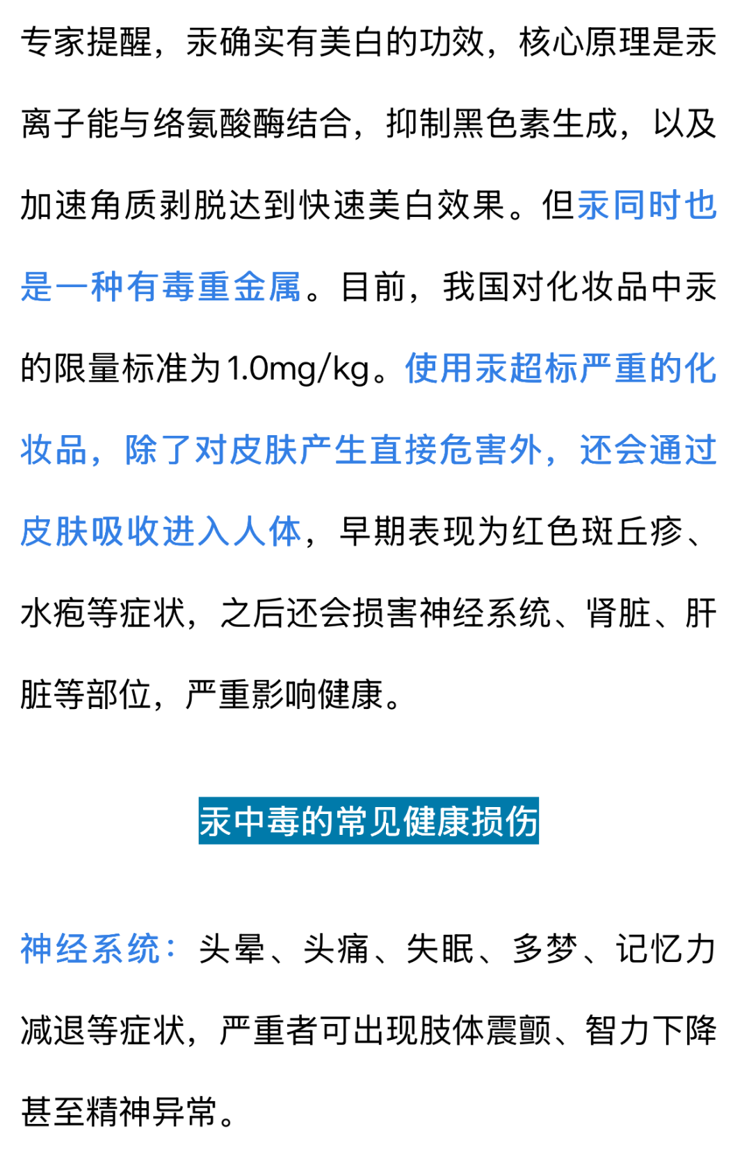 宁波的方女士看到邻居用一款美白祛斑化妆品效果不错,便也买了一套。用了3个月后,原本健康的她竟被诊断为汞中毒。经宁波市疾控中心理化科检测,该化妆品汞含量超标近5000倍!