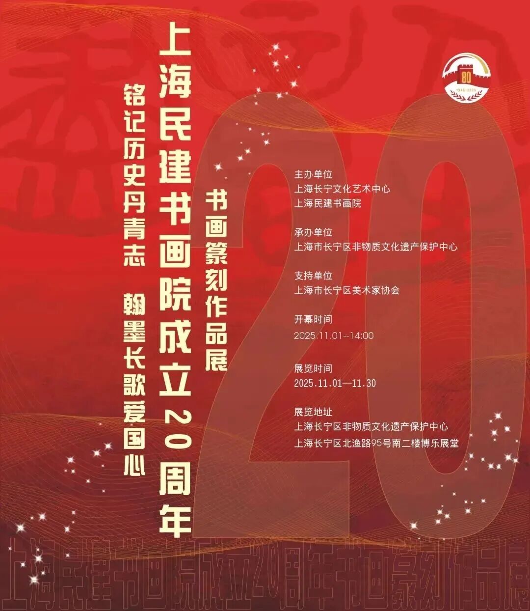 11月1日(周六)14:00,在长宁区非物质文化遗产保护中心(北渔路95号南二楼博乐展堂),上海民建书画院成立20周年书画篆刻作品展启幕!此次展览以“铭记历史丹青志,翰墨长歌爱国心”为核心理念,汇聚众多艺术家的佳作。【详情】