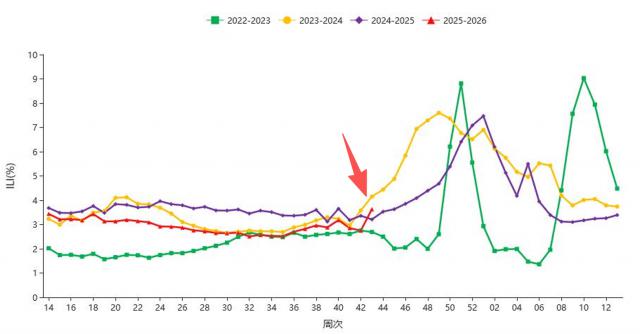 (2022-2026 年度北方省份哨点医院报告的流感样病例占门急诊病例总数比例。今年的看红色的线 [ 5 ] )